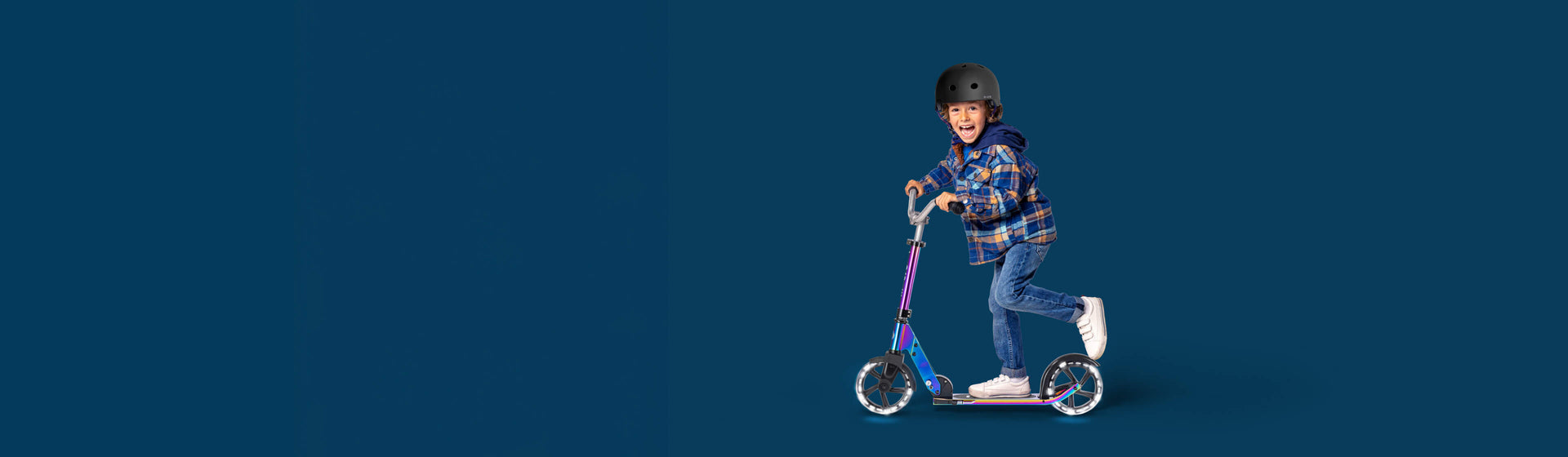 Our genius light-up LED wheels use induction energy to turn the power the kids create as they scoot into bright white light. No batteries. No fuss.