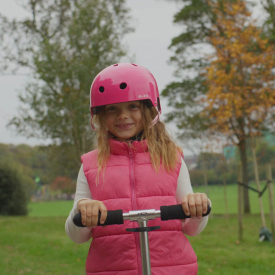 We believe all children should wear a helmet when scooting, though we know getting them to actually wear one can be easier said than done. A helmet provides crucial protection in the event of a fall. For tips on encouraging your child to wear a helmet, please visit our Scoot Safe section.